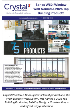 QUEENS, NY, December 16, 2025 – National manufacturer Crystal Window & Door System’s award-winning products continue to be recognized by the national design and construction industry. The company’s new aluminum Series W50i Window Wall System was named to the Building Design+Construction (BD+C) Magazine 2025 Top 75 Building Products List in the November/December 2025 issue. The published annual list covers not just fenestration-related, but all recently introduced building products used in new and rehab commercial construction projects, adding to the prestige of this recognition for Crystal. Several Crystal products have been selected for the annual BD+C list in the past.