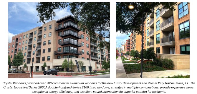 QUEENS, NY, February 24, 2026 – Crystal Window & Door Systems, the award-winning national manufacturer, continues to be the supplier of choice for new Dallas area developments. Crystal recently supplied over 700 expansive quality, energy efficient windows for the new construction mid-rise residential project The Park at Katy Trail. Located in the Uptown Dallas neighborhood on Carlisle Street, The Park at Katy Trail consists of two 6-story brick face multi-family buildings with luxury rental apartments